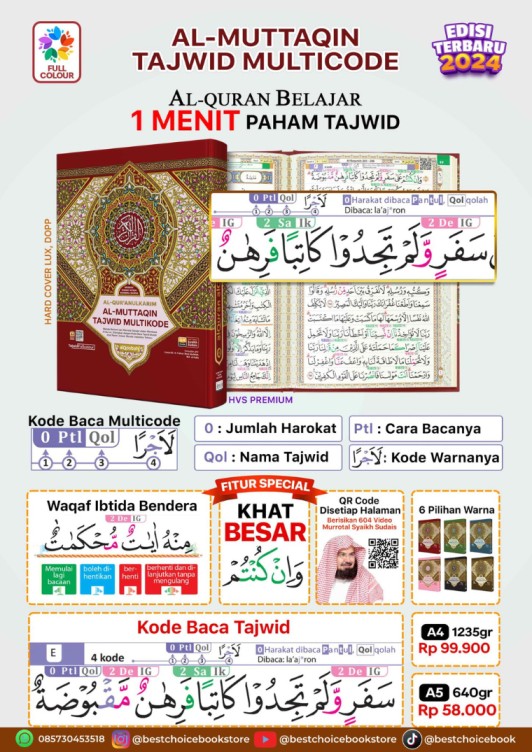 Al-Qur’an Al-Muttaqin Tajwid Multicode Edisi Terbaru 2024 adalah inovasi modern dalam pembelajaran tajwid. Dengan fitur 1 Menit Paham Tajwid, Kode Baca Multicode, Khat Besar, Waqaf Ibtida Bendera, dan QR Code Murottal, mushaf ini membantu semua kalangan untuk membaca Al-Qur’an dengan lebih mudah, cepat, dan benar.