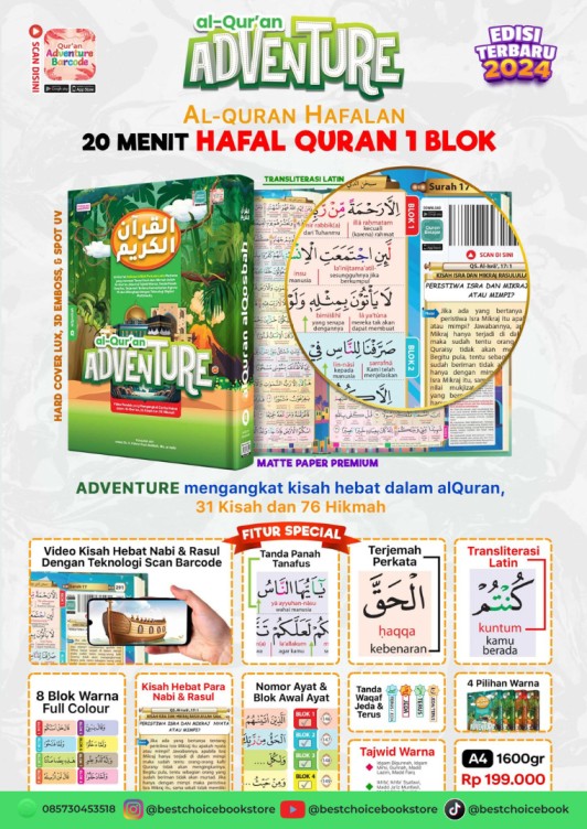 Al-Qur’an Adventure Edisi Terbaru 2024 adalah pilihan terbaik bagi Anda yang ingin menghafal Al-Qur’an dengan cara mudah, cepat, dan menyenangkan. Dengan konsep 20 menit hafal 1 blok, dilengkapi fitur teknologi scan barcode, tajwid warna, transliterasi latin, dan terjemah perkata, Al-Qur’an ini menjadi solusi inovatif untuk semua kalangan.
