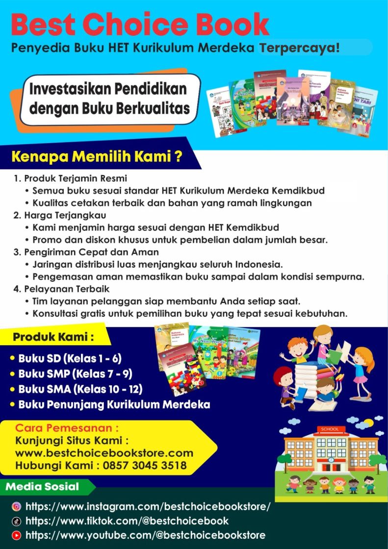Bagi sekolah, yayasan, koperasi, maupun instansi pendidikan yang ingin melakukan pemesanan, dapat langsung menghubungi nomor distributor Best Choice Book di WA 0857-3045-3518 untuk informasi lengkap mengenai katalog, harga, dan sistem pengiriman.