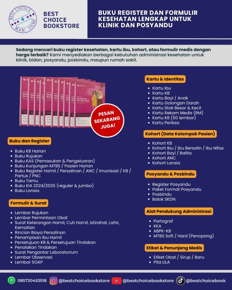 Untuk menjawab kebutuhan tersebut, Best Choice Bookstore hadir sebagai supplier terpercaya yang menyediakan beragam perlengkapan administrasi kesehatan. Melalui website resmi bestchoicebookstore.com dan kontak langsung via WA 085730453518, Anda dapat memperoleh berbagai produk dengan mudah, cepat, dan harga bersaing.