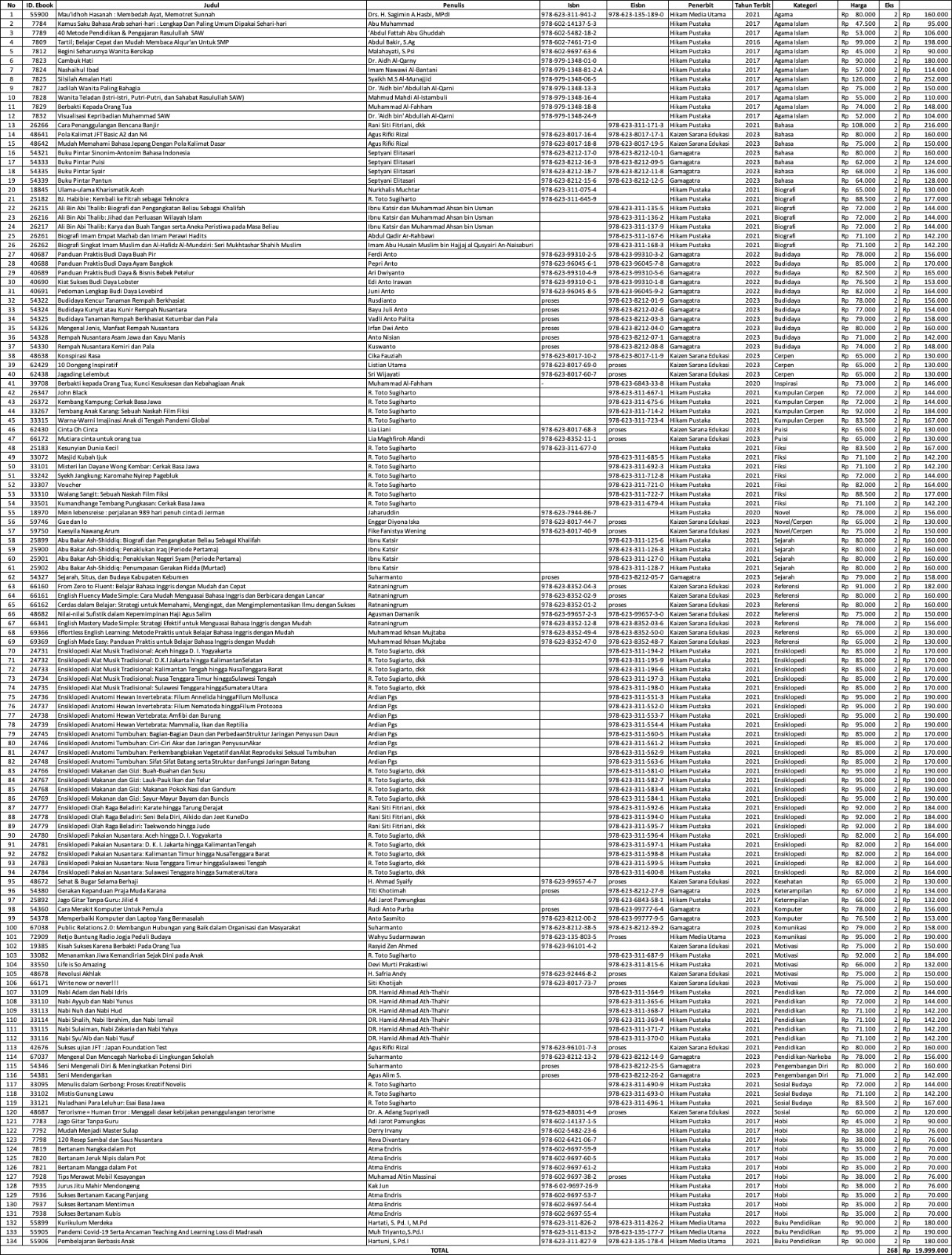 | No | ID. Ebook | Judul | Penulis | Isbn | Eisbn | Penerbit | Tahun Terbit | Kategori | Harga | Eks | |
