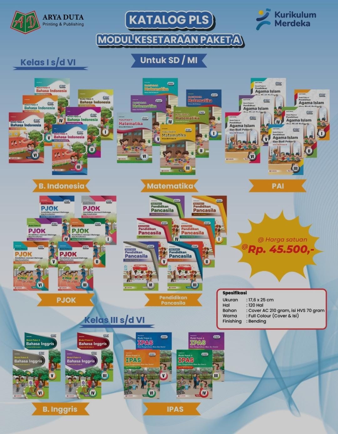 | 10 | Pendidikan Pancasila | SD/MI | IV | B | 978-623-273-565-1 (jil.4) | Joko Ida Ardiana Dewi | Arya Duta, CV | 120 | 17,6 x 25 cm | AC 210 g | Recycle Anchor | 4 warna | 4 warna | Perfect Binding | UV Vernish | Rp 45.500 | |