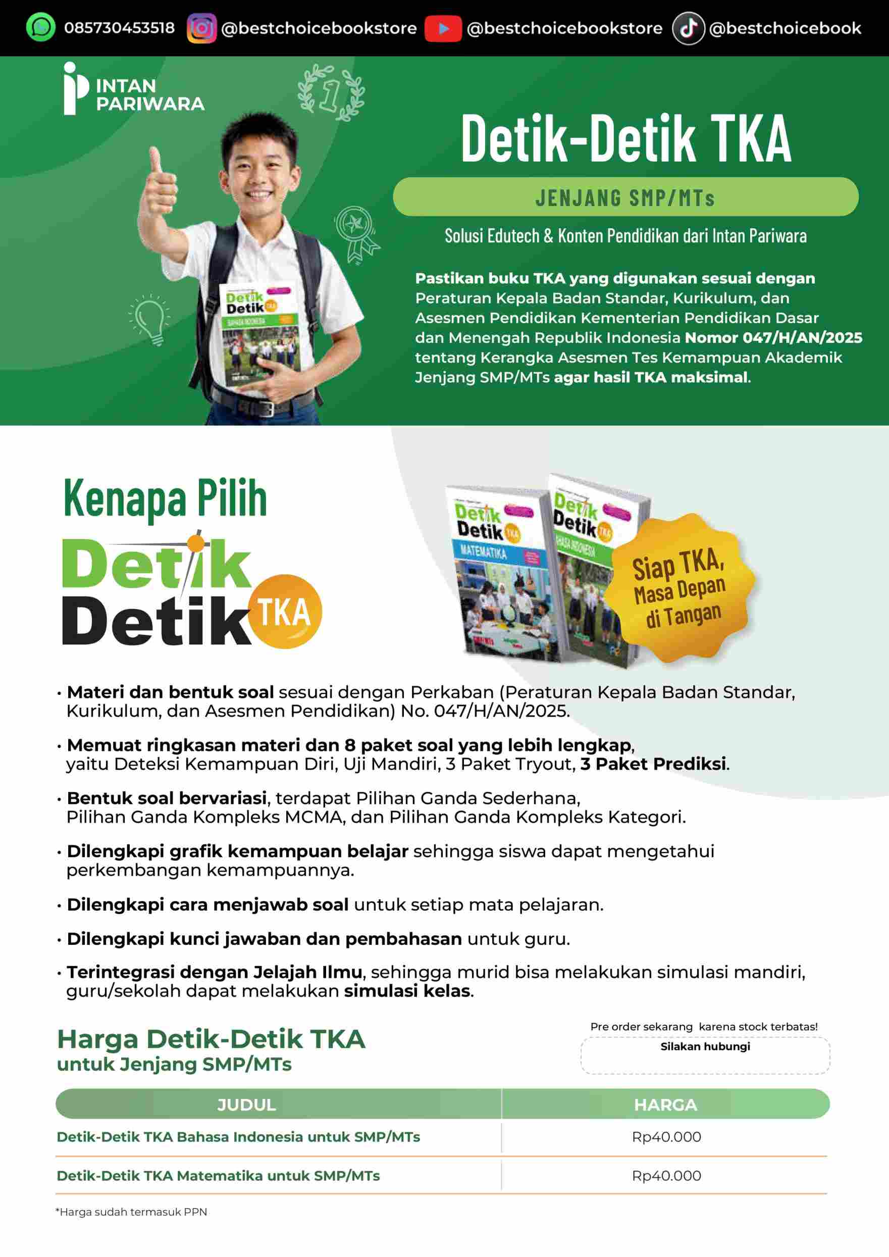 Buku Detik-Detik TKA bukan sekadar kumpulan soal, melainkan panduan lengkap yang dirancang untuk membantu siswa memahami materi secara menyeluruh serta mengukur kemampuan akademiknya. Berikut beberapa alasan utama mengapa buku ini menjadi pilihan terbaik bagi siswa dan guru jenjang SMP/MTs: