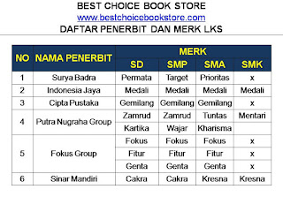 Kami sebagai Distributor LKS SMK menyediakan LKS untuk jenjang Sekolah Menengah Atas khususnya Sekolah Menengah Kejuruan (SMK) dari berbagai macam penerbit buku yang telah menerbitkan LKS dalam berbagai macam merk. Kami sebagai Distributor LKS SMK juga mengutamakan kualitas barang yang kami jual. Kami mengecek setiap barang sebelum mengirimkan ke lokasi anda. Hal tersebut dilakukan supaya tidak ada barang yang cacat atau rusak yang kami kirimkan ke anda. Kami menyediakan berbagai merk dari berbagai penerbit buku. Berikut ini adalah daftar penerbit buku serta merk yang disediakan untuk LKS:
