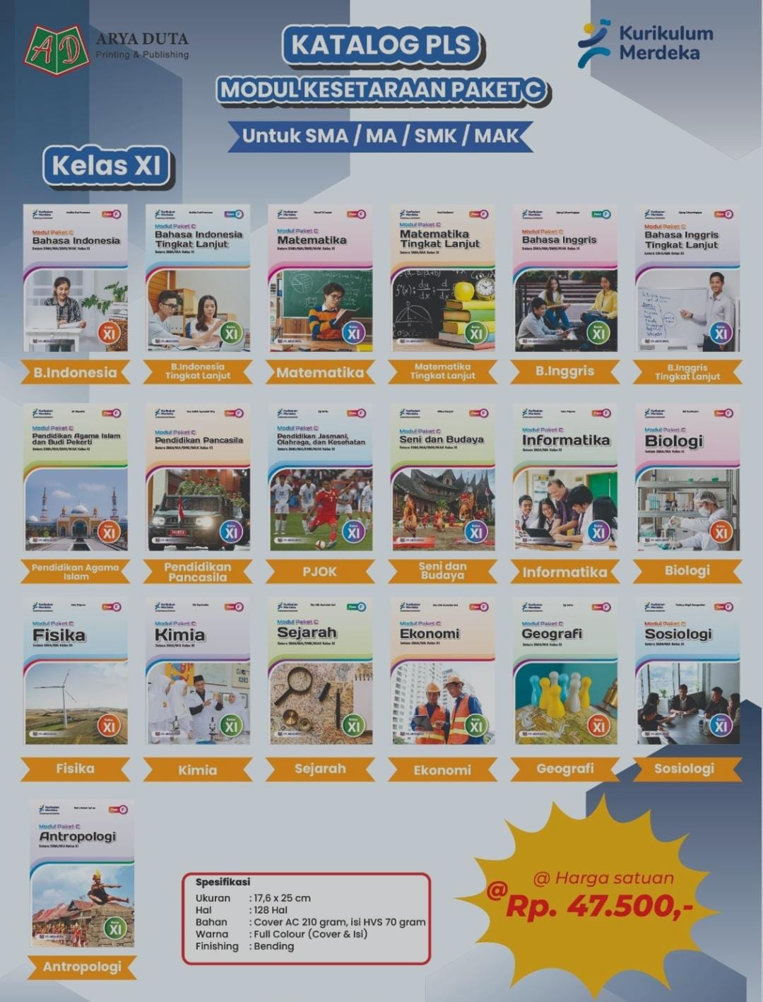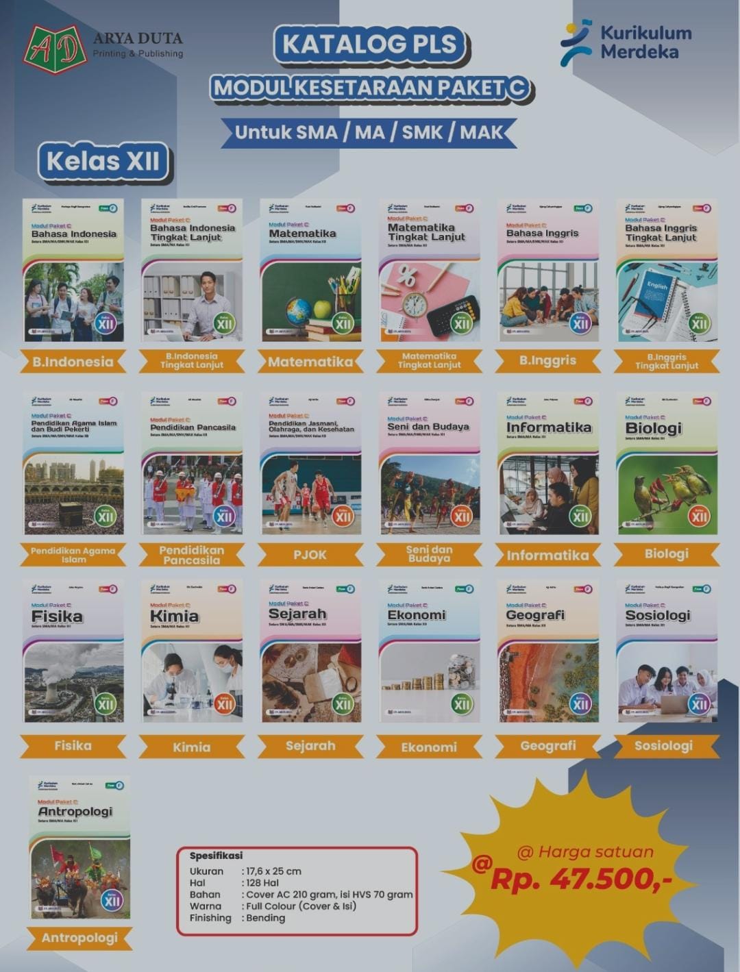 Modul Paket C dari Penerbit Arya Duta disusun sesuai dengan struktur Kurikulum Merdeka untuk jenjang SMA/MA/SMK/MAK, mencakup pembelajaran untuk Kelas X, XI, dan XII.