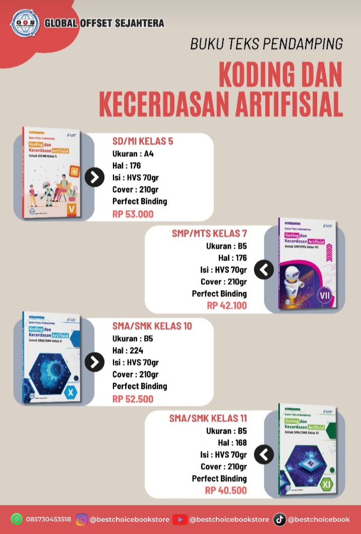 Koding dan kecerdasan artifisial adalah dua keterampilan yang sangat penting bagi generasi masa depan. Dengan memiliki buku teks pendamping yang tepat, siswa dapat mempelajari keterampilan ini dengan cara yang menyenangkan dan efektif. Buku teks dari penerbit GOS adalah pilihan yang tepat untuk membantu siswa dari berbagai jenjang pendidikan memahami konsep-konsep dasar koding dan kecerdasan artifisial dengan cara yang menarik dan aplikatif. Dapatkan buku teks ini sekarang juga dan bantu anak-anak kita mempersiapkan masa depan yang cerah dalam dunia digital!