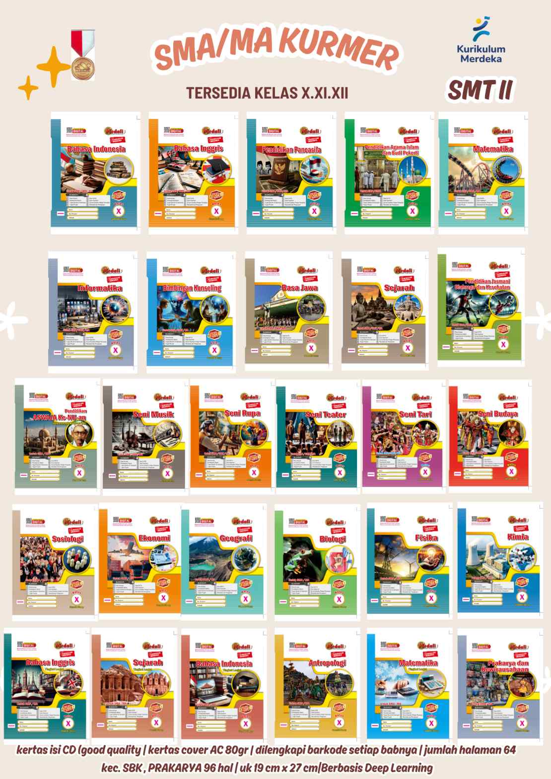 Buku-buku SMA/MA Kurmer Semester II ini diterbitkan dalam berbagai mata pelajaran, mencakup seluruh bidang studi yang diajarkan di sekolah menengah. Setiap buku memiliki standar mutu tinggi dengan kertas isi CD (good quality) serta cover kertas AC 80 gram, memastikan hasil cetakan kuat, rapi, dan nyaman dibaca dalam jangka panjang.