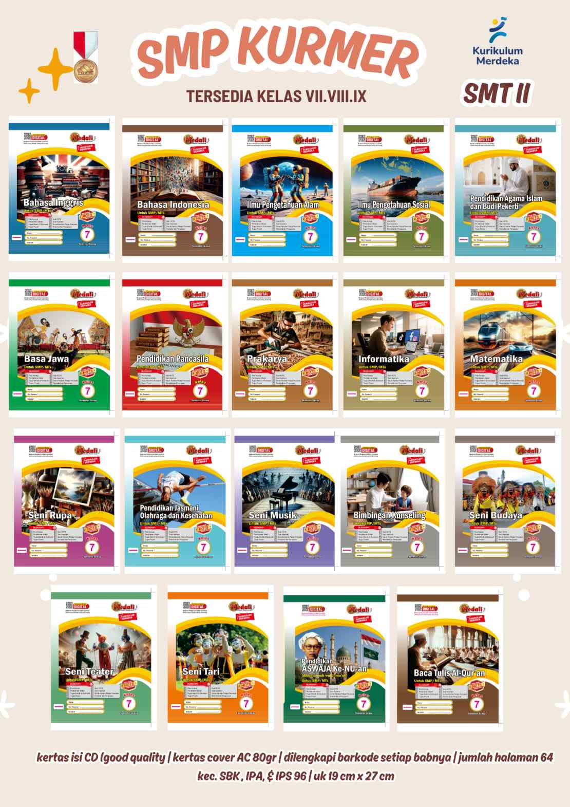 Buku pelajaran menjadi bagian penting dalam mendukung proses pembelajaran Kurikulum Merdeka di tingkat Sekolah Menengah Pertama (SMP). Salah satu koleksi buku lengkap yang kini banyak digunakan oleh sekolah-sekolah adalah SMP Kurmer (Kurikulum Merdeka) Semester II, yang dirancang untuk memenuhi kebutuhan belajar siswa kelas VII, VIII, dan IX.