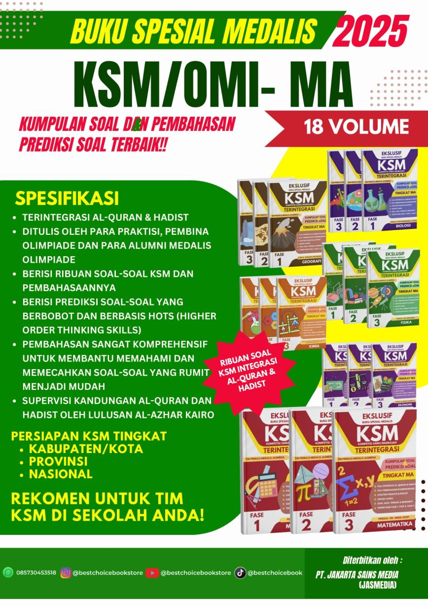 Bagi Anda guru pembina, kepala madrasah, orang tua, maupun siswa MA yang sedang mempersiapkan diri menghadapi ajang Kompetisi Sains Madrasah (KSM) atau Olimpiade Madrasah Indonesia (OMI), kini telah hadir solusi terbaik dan paling lengkap: Buku Spesial Medalis KSM/OMI-MA 2025 terbitan resmi Penerbit JASMEDIA (PT. Jakarta Sains Media).