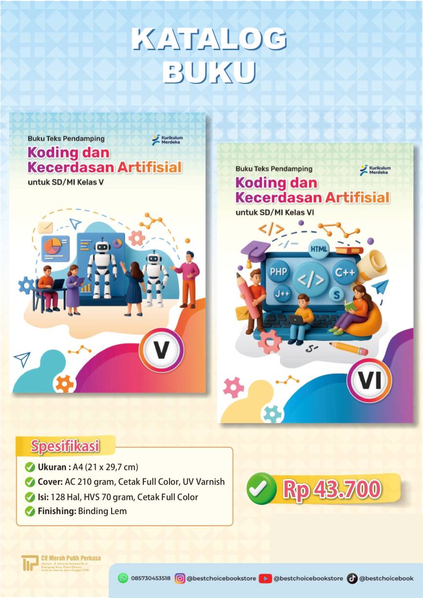 Dalam dunia pendidikan modern, kemampuan memahami teknologi dan berpikir komputasional menjadi kebutuhan penting. Salah satu sumber belajar yang mendukung hal ini adalah Buku Teks Pendamping Koding dan Kecerdasan Artifisial untuk SD/MI Kelas V dan VI. Buku ini disusun khusus berdasarkan Kurikulum Merdeka, dengan tujuan membantu siswa mengenal konsep koding (coding) dan kecerdasan artifisial (artificial intelligence) secara menyenangkan, berwarna, dan mudah dimengerti sesuai jenjang usia sekolah dasar.
