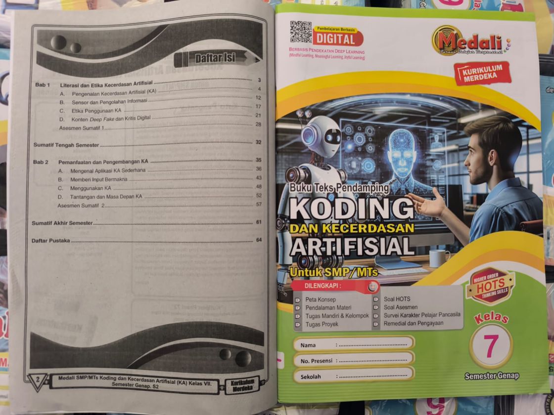 Kebutuhan terhadap penguatan kompetensi digital di tingkat SMP/MTs semakin meningkat seiring arah kurikulum yang menekankan penguasaan koding, literasi digital, dan kecerdasan artifisial. Untuk mendukung proses pembelajaran tersebut, salah satu materi ajar yang banyak digunakan sekolah adalah Lembar Kerja Siswa (LKS) Koding dan Kecerdasan Artifisial (KA) dari Medali, yang diperuntukkan bagi kelas 7 semester genap sesuai Kurikulum Merdeka.