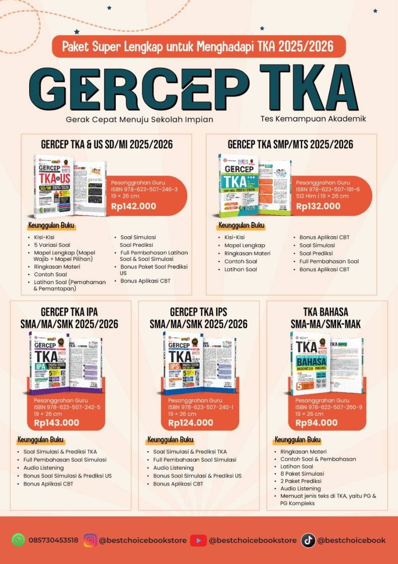 Dalam menghadapi Tes Kemampuan Akademik (TKA) tahun ajaran 2025/2026, para siswa dan orang tua tentu membutuhkan solusi persiapan yang lengkap, terarah, dan terpercaya. Paket buku GERCEP TKA (Gerak Cepat Menuju Sekolah Impian) hadir sebagai jawaban atas kebutuhan tersebut. Dikembangkan oleh tim profesional dari Best Choice Bookstore, paket ini telah terbukti menjadi panduan terbaik bagi siswa SD/MI, SMP/MTs, hingga SMA/MA/SMK/MAK.