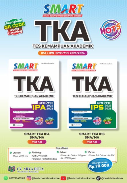 Buku SMART TKA Tes Kemampuan Akademik SMA/MA 2025/2026 adalah pilihan tepat bagi siswa yang ingin serius mempersiapkan diri menghadapi seleksi perguruan tinggi. Dengan materi lengkap, soal HOTS, pembahasan detail, serta fitur QR Code Audio Listening, buku ini bukan sekadar kumpulan soal, melainkan paket lengkap persiapan TKA.