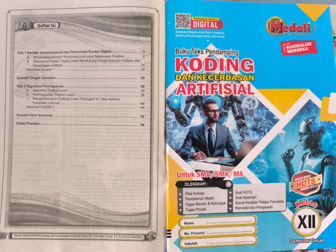 LKS Medali Indonesia Jaya kembali menghadirkan buku teks pendamping terbaru dengan tema Koding dan Kecerdasan Artifisial untuk jenjang SMA, SMK, dan MA Kelas XI. Buku ini disusun secara khusus untuk mendukung penerapan Kurikulum Merdeka yang berfokus pada pembelajaran berbasis proyek, pengembangan kompetensi digital, serta pemahaman mendalam terhadap dunia teknologi modern.