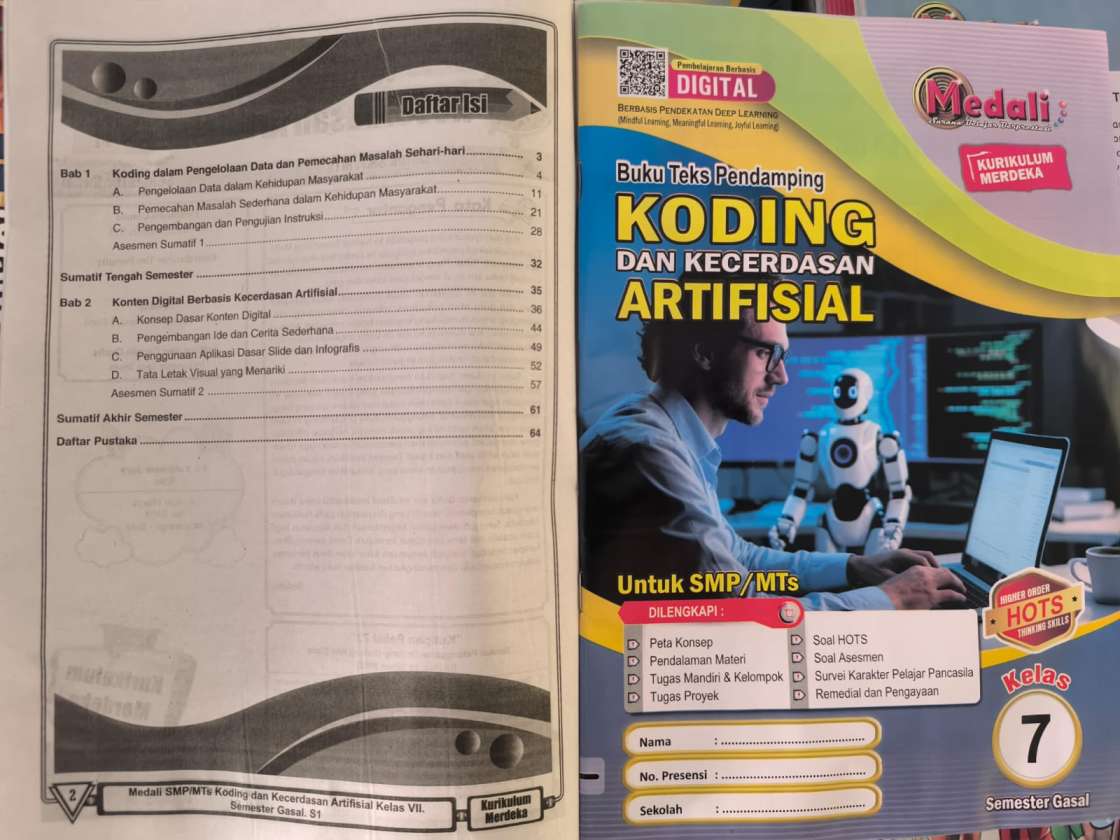 Buku Lembar Kerja Siswa (LKS) Medali Koding dan Kecerdasan Artifisial merupakan buku teks pendamping pembelajaran untuk siswa SMP/MTs Kelas VII Semester Gasal. Buku ini diterbitkan oleh Medali Indonesia Jaya dan disusun berdasarkan Kurikulum Merdeka, yang menekankan pembelajaran aktif, kreatif, dan inovatif.