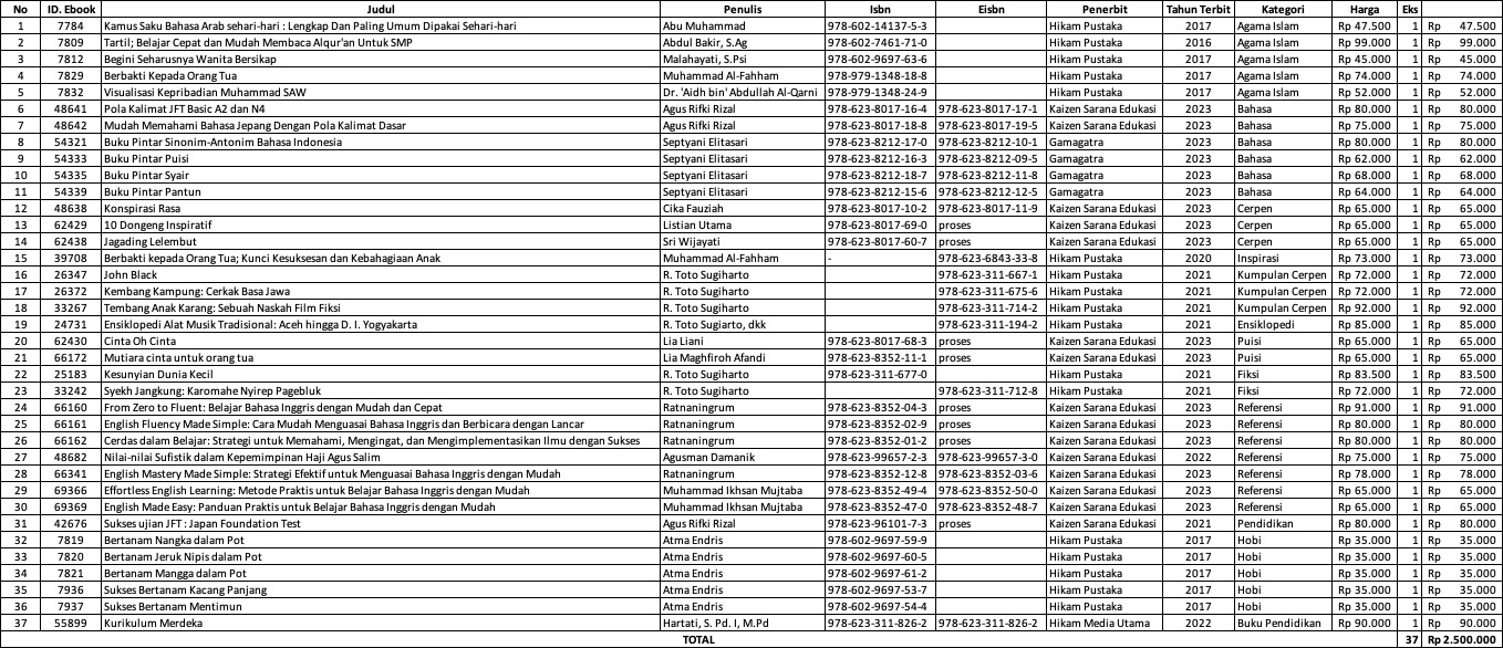 | No | ID. Ebook | Judul | Penulis | Isbn | Eisbn | Penerbit | Tahun Terbit | Kategori | Harga | Eks | |