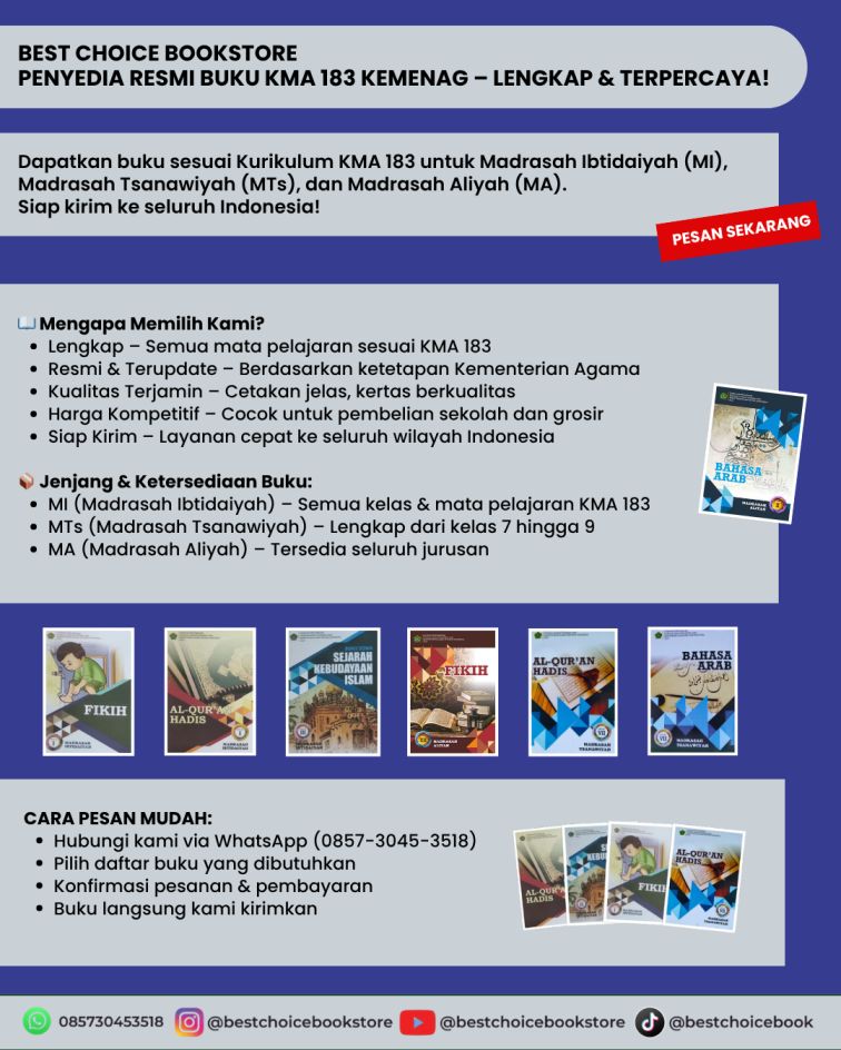 Dapatkan buku sesuai Kurikulum KMA 183 untuk Madrasah Ibtidaiyah (MI), Madrasah Tsanawiyah (MTs), dan Madrasah Aliyah (MA).