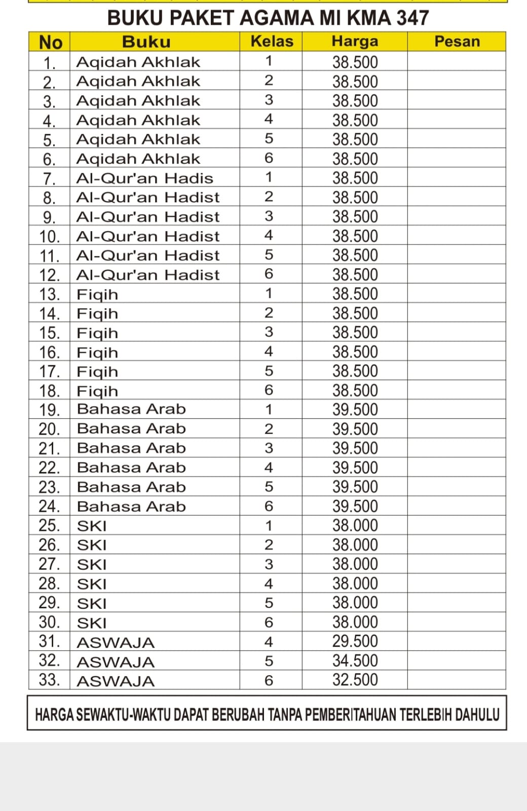| Nama Barang | Penyedia/Supplier/Distributor/Agen/Jual Buku Paket Agama MA KMA 347 Kelas 10,11,12 [WA 085730453518] |