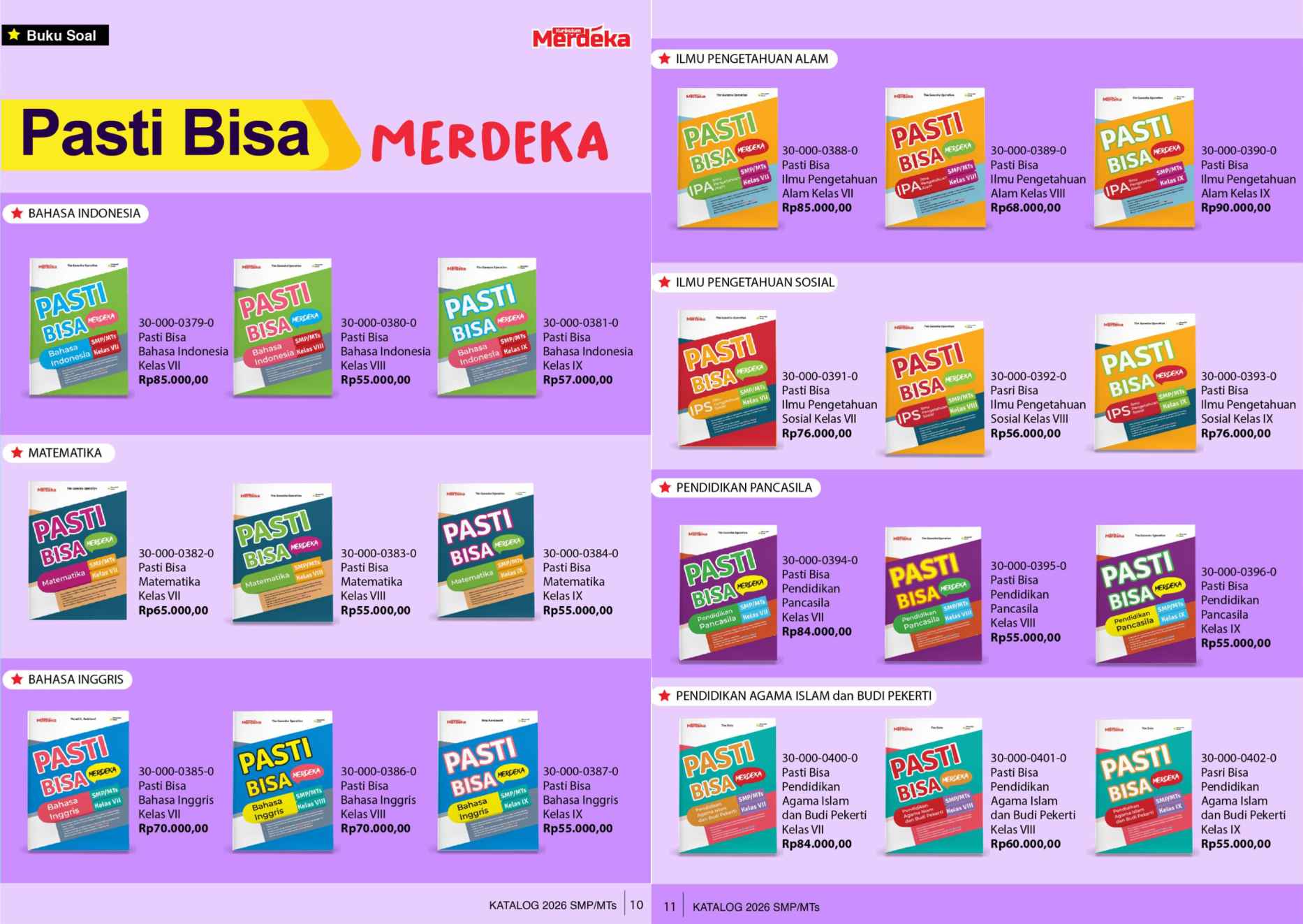Berdasarkan katalog yang ditampilkan, seri Pasti Bisa Merdeka mencakup berbagai mata pelajaran inti yang diajarkan di SMP/MTs. Setiap buku disajikan secara sistematis sesuai jenjang kelas dan mata pelajaran, sehingga memudahkan sekolah, guru, maupun siswa dalam menentukan kebutuhan buku pembelajaran.