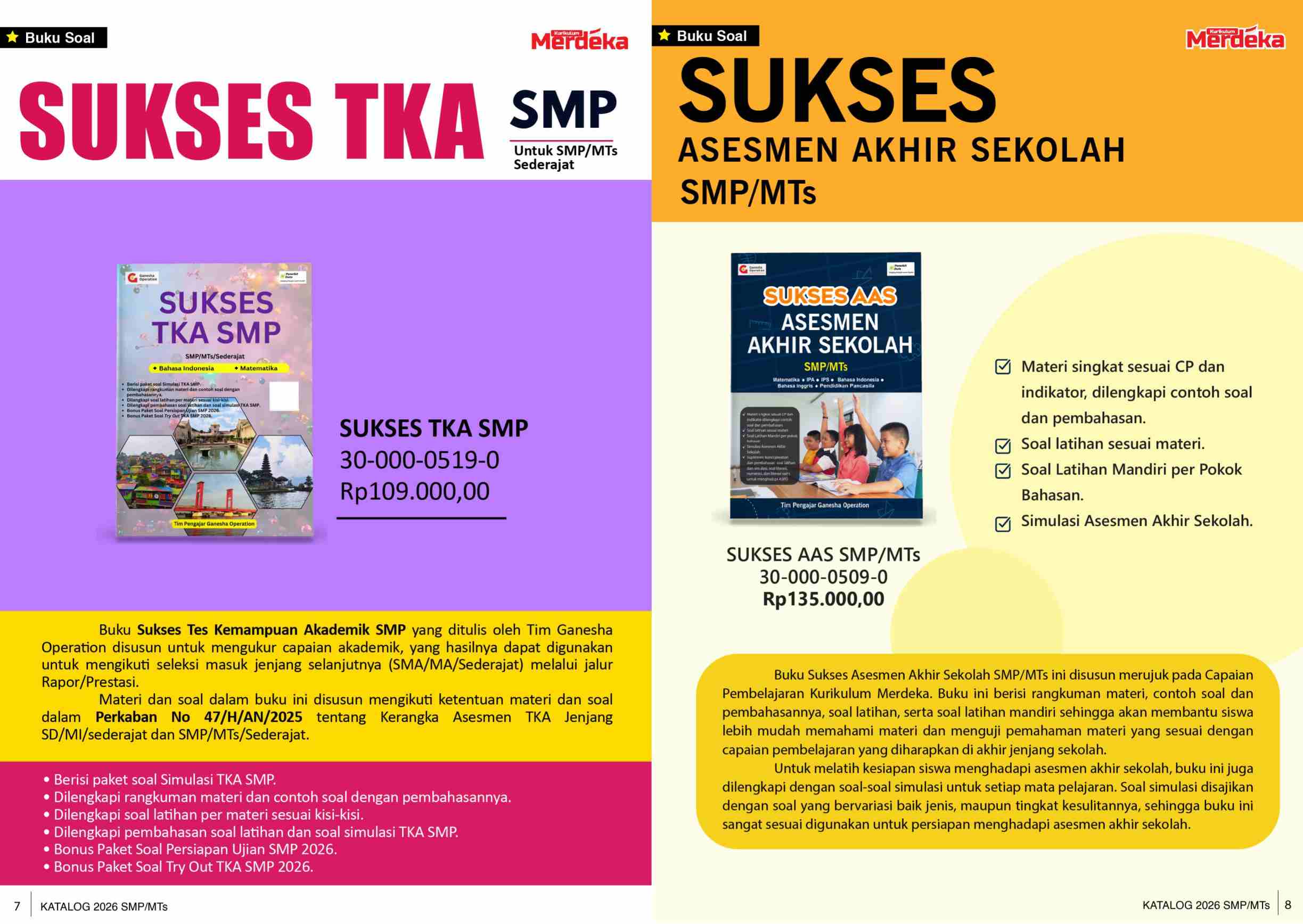 Kedua buku ini dirancang untuk membantu siswa mempersiapkan diri menghadapi Tes Kemampuan Akademik (TKA) serta Asesmen Akhir Sekolah (AAS) secara optimal. Dengan materi yang disusun berdasarkan Capaian Pembelajaran (CP) dan indikator Kurikulum Merdeka, buku-buku ini sangat direkomendasikan untuk digunakan oleh sekolah, guru, siswa, maupun orang tua sebagai bahan pendamping belajar.