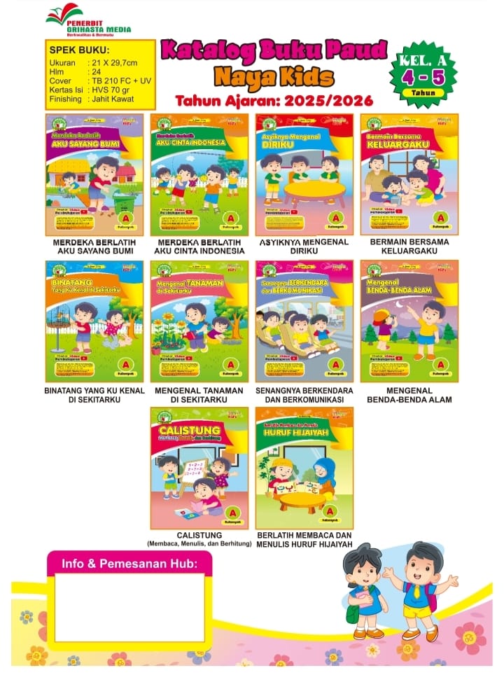Apakah Anda sedang mencari penyedia buku PAUD TK A terbaru untuk tahun ajaran 2025/2026? Kami adalah supplier, distributor, agen, dan penjual resmi buku PAUD TK A Naya Kids Grihasta Media yang telah disesuaikan dengan Kurikulum Merdeka. Hubungi kami sekarang melalui WhatsApp 085730453518 untuk mendapatkan penawaran terbaik!