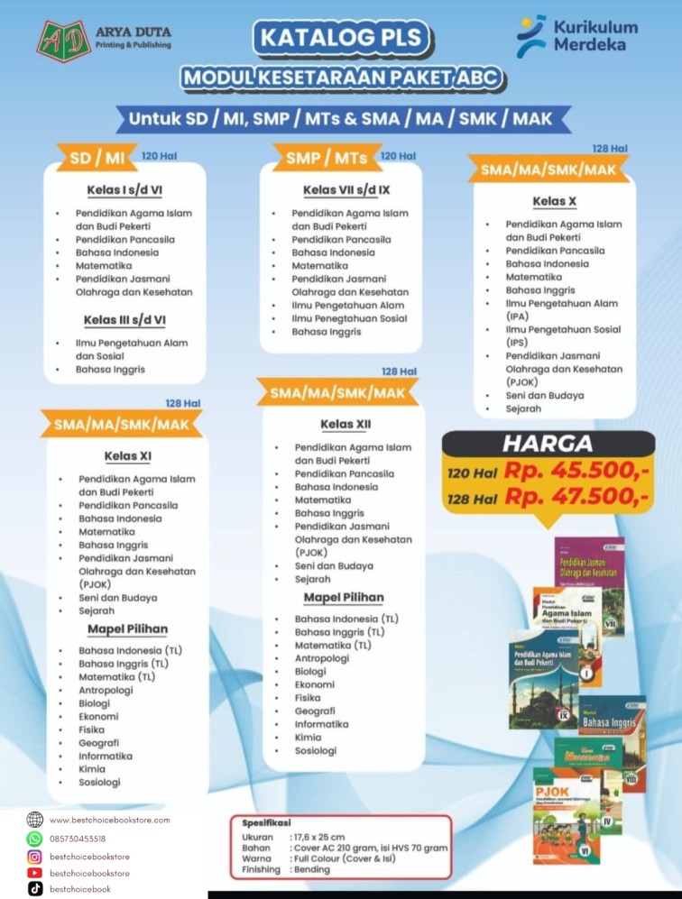 Penerbit Arya Duta menghadirkan Katalog PLS Modul Kesetaraan Paket A, B, dan C yang disusun sesuai dengan Kurikulum Merdeka, sehingga mampu mendukung proses pembelajaran yang relevan, kontekstual, dan adaptif bagi peserta didik pendidikan nonformal di seluruh Indonesia.