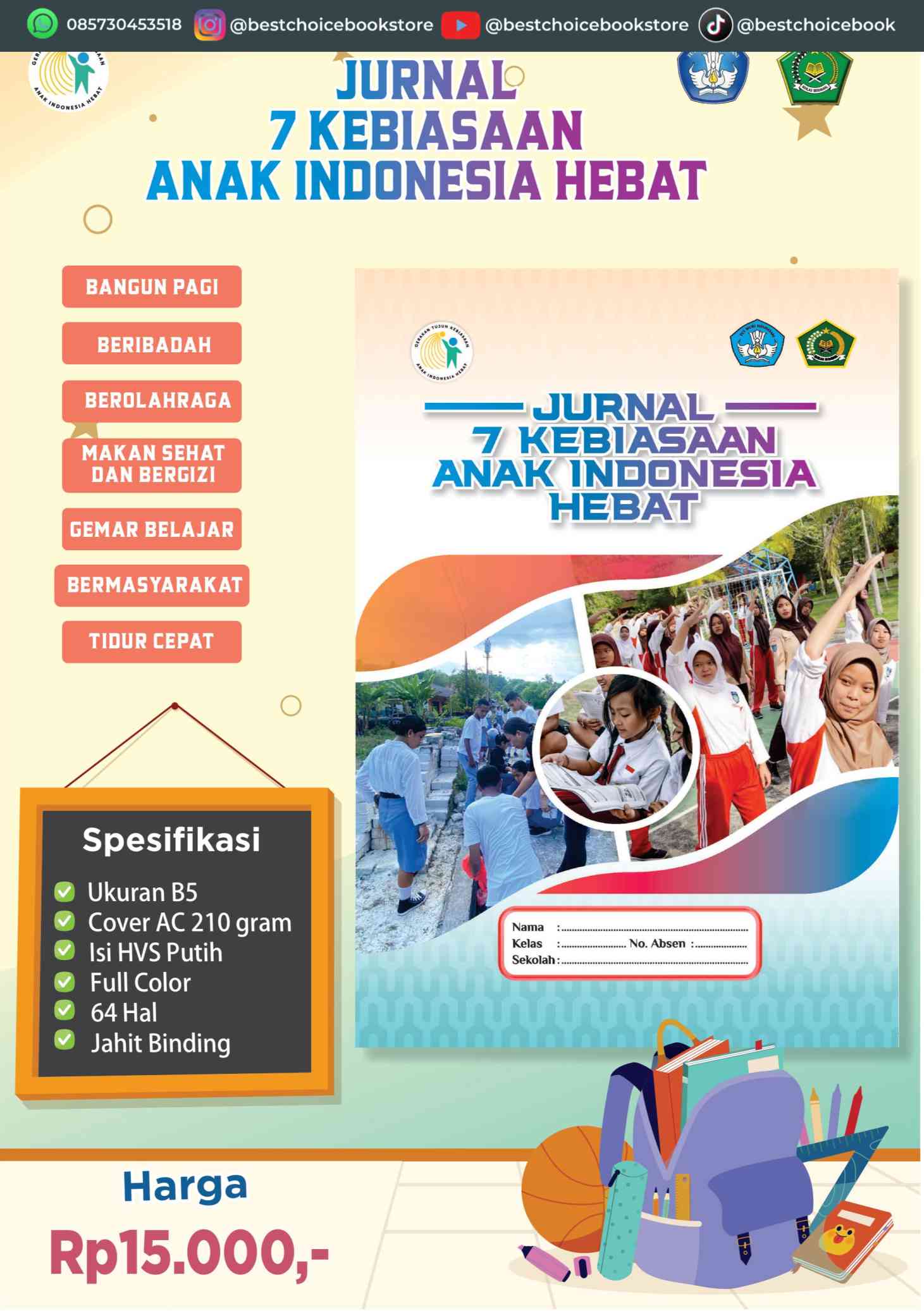 Jurnal 7 Kebiasaan Anak Indonesia Hebat merupakan buku pendamping kegiatan harian siswa yang dirancang untuk menanamkan nilai-nilai positif sejak dini. Produk ini hadir sebagai media edukatif yang membantu anak-anak Indonesia menjadi pribadi yang disiplin, sehat, aktif, dan berakhlak mulia. Buku ini diterbitkan oleh Penerbit Merah Putih Perkasa dan bisa dipesan langsung melalui WA Distributor 0857-3045-3518.