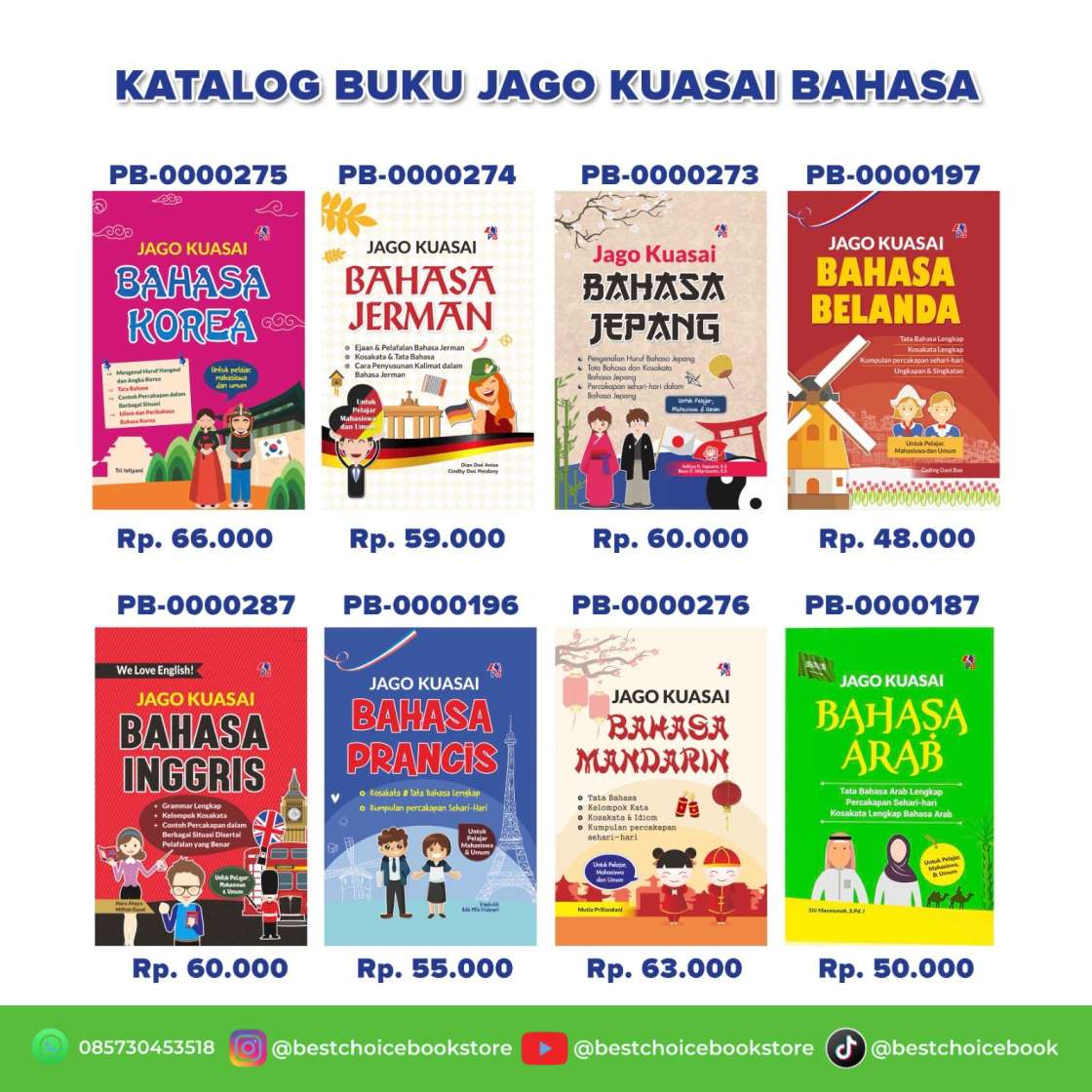 Belajar bahasa asing kini menjadi kebutuhan penting di era globalisasi. Banyak orang ingin menguasai bahasa asing untuk menunjang pendidikan, karier, hingga komunikasi lintas budaya. Penerbit Pustaka Baru Press menghadirkan seri “Jago Kuasai Bahasa”, yaitu kumpulan buku panduan belajar berbagai bahasa asing populer yang mudah dipahami dan cocok untuk semua kalangan.