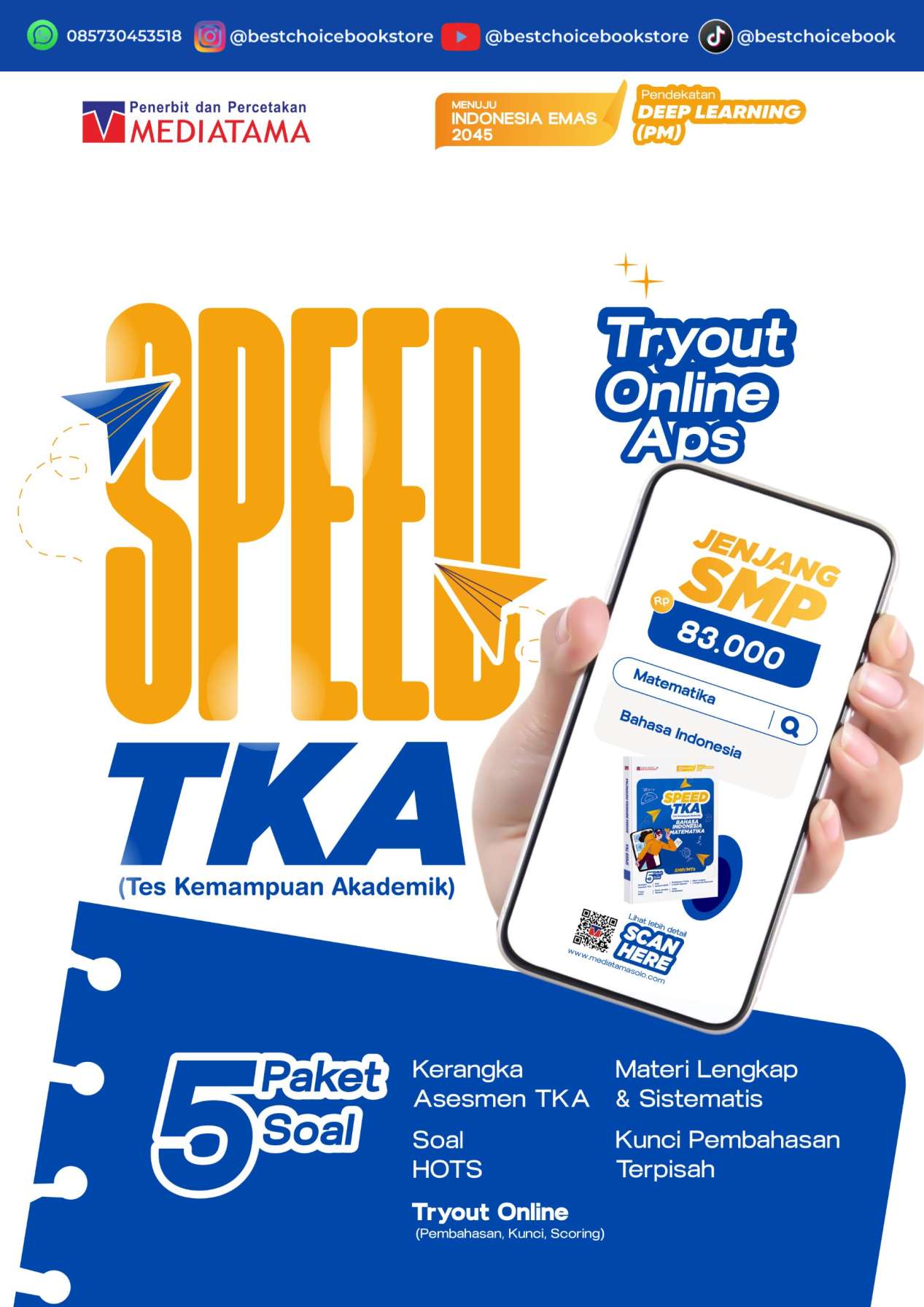 Menghadapi ujian sekolah kini lebih mudah dengan buku SPEED TKA (Tes Kemampuan Akademik) jenjang SMP. Buku ini menyajikan 5 paket soal dengan pendekatan Deep Learning (PM), yang mendorong siswa memahami konsep, bukan sekadar menghafal.