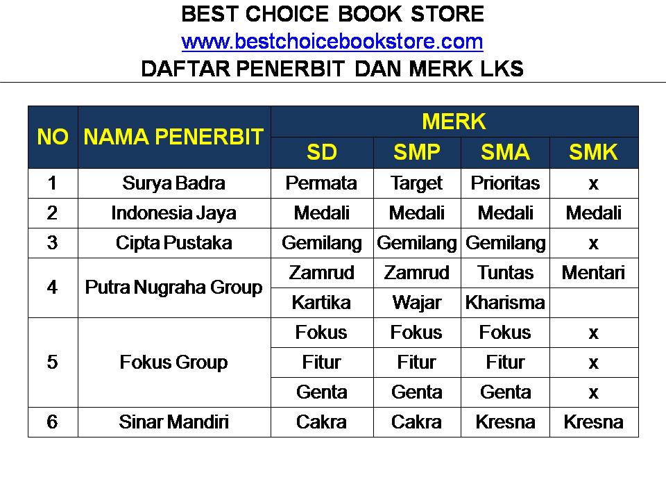 Kami sebagai Suplier LKS SD/SMP/SMA menawarkan harga yang sangat terjangkau bagi anda yang berminat bekerja sama dengan kami. Kami sebagai Suplier LKS SD/SMP/SMA juga dapat memberikan potongan harga untuk pemesanan dalam jumlah besar. Jika anda berminat bekerja sama dengan kami, anda dapat menghubungi contact person yang tertera di halaman blog kami. Anda dapat menghubungi kami melalui SMS/ Telepon/ Whatsapp. Berikut ini adalah list produk yang kami sediakan: