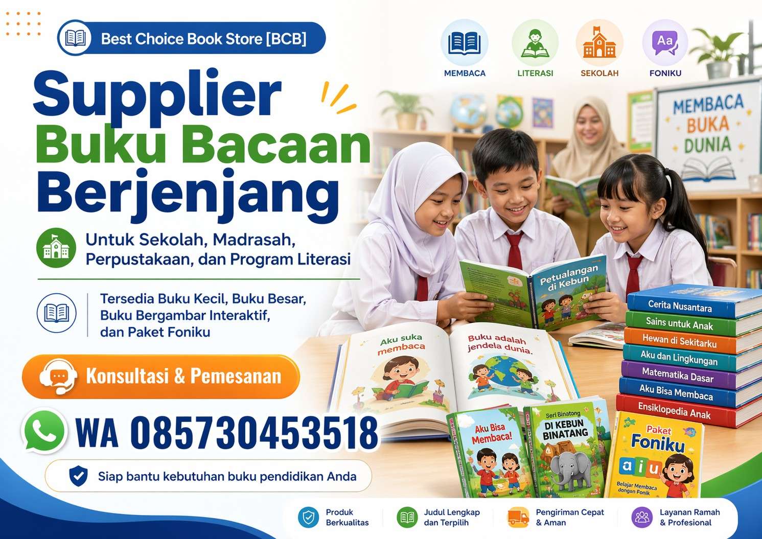 Tingkatkan program literasi sekolah dengan buku bacaan berjenjang, buku besar, buku kecil, buku bergambar interaktif, dan Paket Foniku melalui Best Choice Book Store.