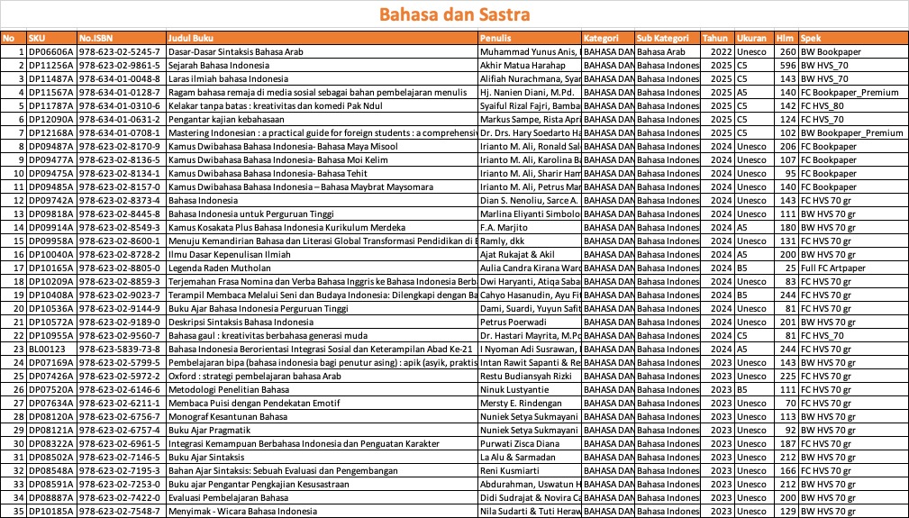| 20 | DP10536A | 978-623-02-9144-9 | Buku Ajar Bahasa Indonesia Perguruan Tinggi | Dami, Suardi, Yuyun Safitr | BAHASA DAN SASTRA | Bahasa Indonesia | 2024 | Unesco | 81 | FC HVS 70 gr |