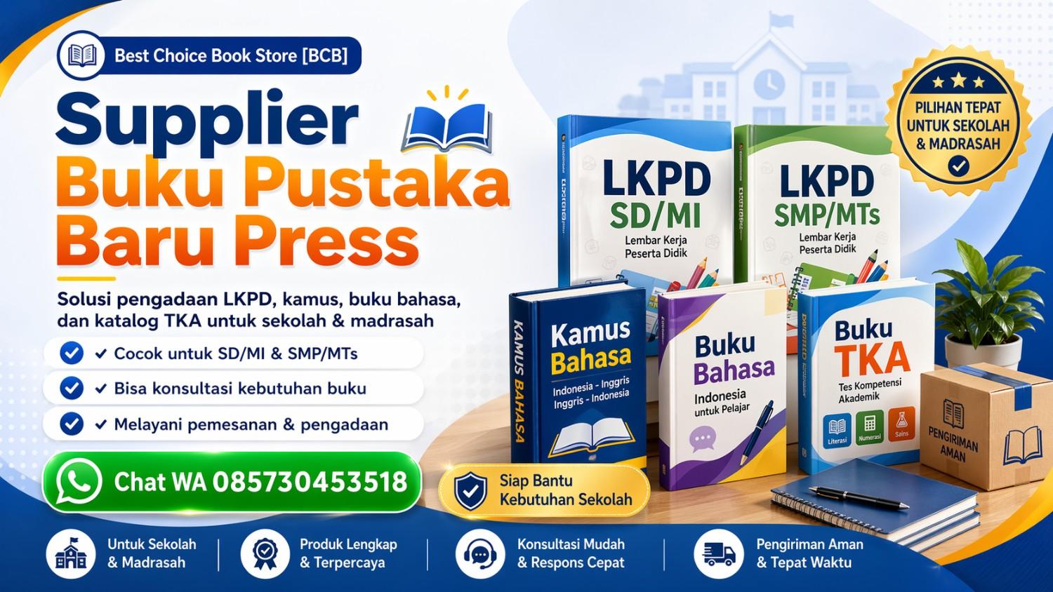 Jika sekolah Anda membutuhkan LKPD, buku latihan, kamus, buku bahasa, atau katalog buku pendukung pembelajaran, admin BCB siap membantu mengecek ketersediaan, rekomendasi produk, serta proses pemesanan.
